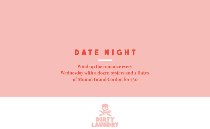 Date Night Wind up the romance every Wednesday with a dozen oysters and 2 flutes of Mumm Grand Cordon for $50! *available from 6pm till late 09 951 0150 | dirtylaundry.co.nz | #getdirty | Ground Floor, 188 Quay Street, Auckland 1010