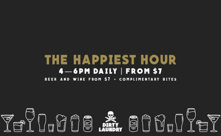 The Happiest Hour Enjoy amazing specials daily at Dirty Laundry Auckland during The Happiest Hour. From $7* Featuring selected beer and wine from $7 and complimentary bites from 4-6pm Daily. *Deals are subject to public holiday surcharges